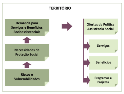 Por fim, a apropriação do conceito de território, tal como desenvolvido pelo geógrafo Milton Santos, permite compreender a forma como as relações sociais se materializam num dado espaço. O território é muito mais do que a paisagem física ou o perímetro que delimita uma comunidade, bairro ou cidade. O território é o espaço recheado pelas relações sociais passadas e presentes, a forma específica de apropriação e interação com o ambiente físico, as ofertas e as ausências de políticas públicas, as relações políticas e econômicas que o perpassam, os conflitos e os laços de solidariedade nele existentes. Isto significa dizer que, em grande medida, as potencialidades ou vulnerabilidades de uma família ou indivíduo são determinadas pelo território no qual ela está inserida. Como conseqüência desta perspectiva, é necessário que o território em si também seja encarado como objeto de intervenção/atuação da política de Assistência Social, para além das ações desenvolvidas com as famílias e indivíduos.